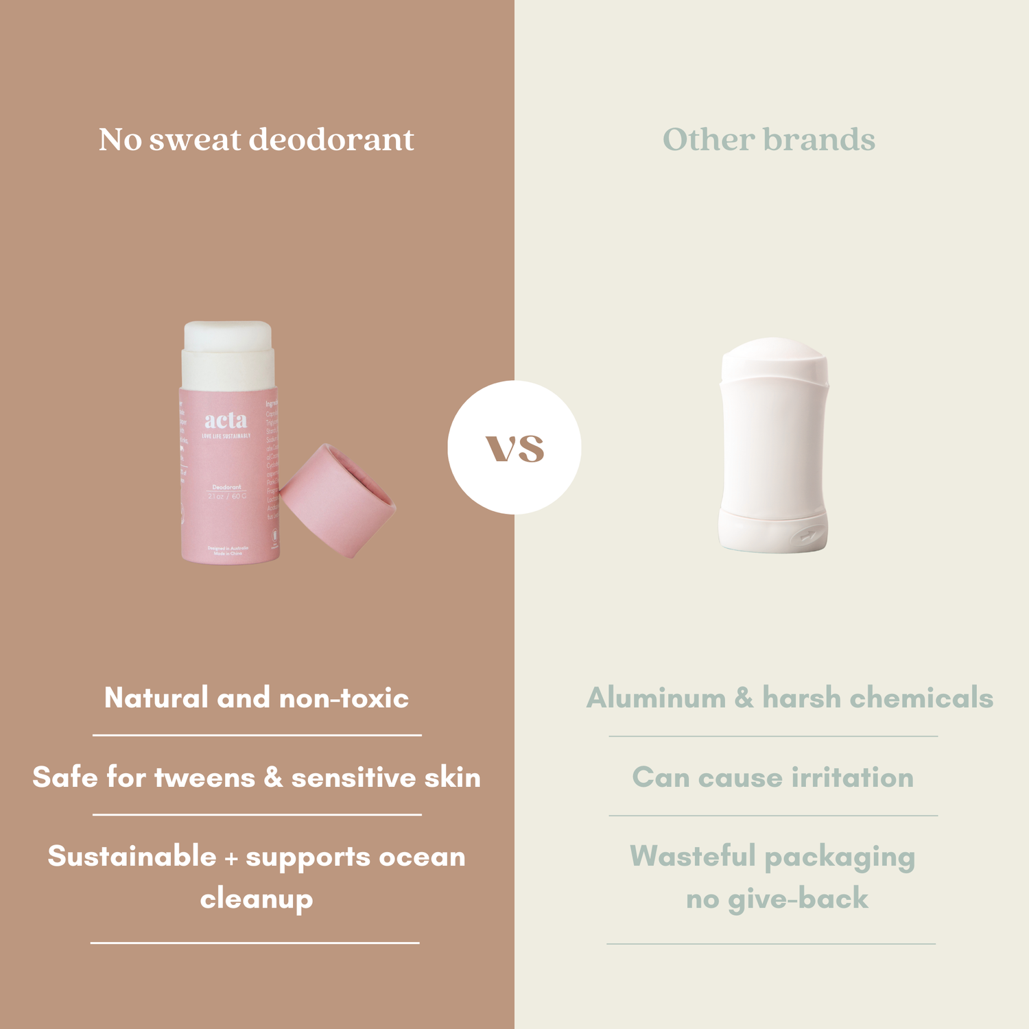 Hi, I’m Sammy — founder of ACTA, mum of two, and a lifelong sweaty Betty. I’ve always been active, and just wanted a deodorant that worked without all the nasties. When my kids hit the age where they needed one too, I started paying closer attention to what we were putting on our skin every day. I couldn’t find anything I trusted — so I made it.That’s how No Sweat was born: safe, natural, and made for real life. For teens, tweens, grown-ups, and anyone who wants to smell fresh without compromising their health or the planet.